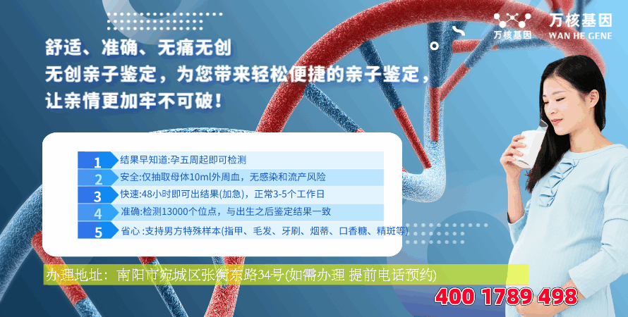 南阳亲子鉴定基因检测,是一家专为南阳周边城市地区服务的亲子鉴定咨询机构,南阳司法亲子鉴定办理地址:南阳市宛城区张衡东路34号(如需办理,需提前预约)预约电话:4001789498。